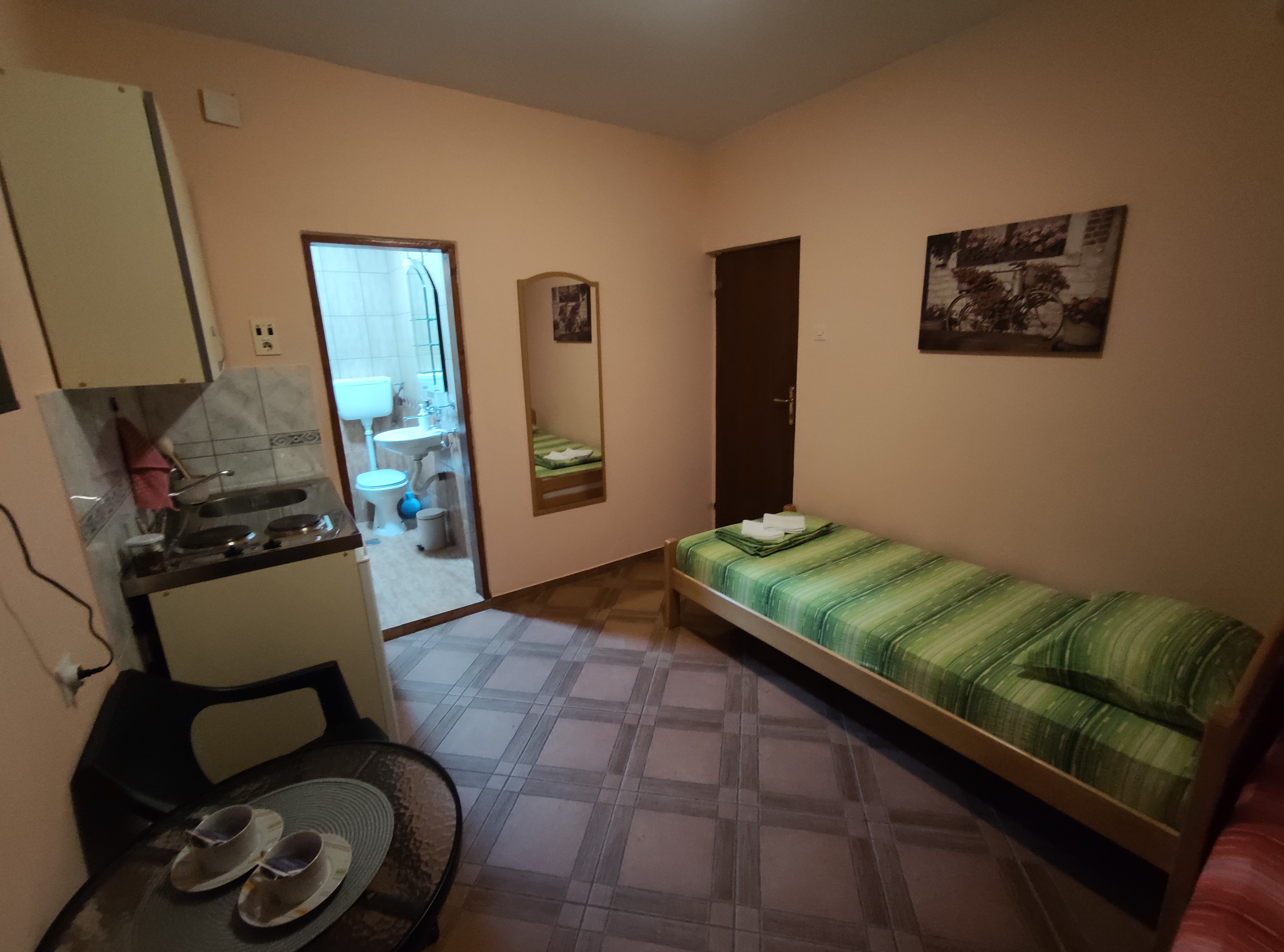 Studio sa mini kuhinjom i kupatilom od 18 m2, klimatizovan, nalazi se na prvom spratu i raspolaže sa dva kreveta i opremljenom terasom ispred ulaza.